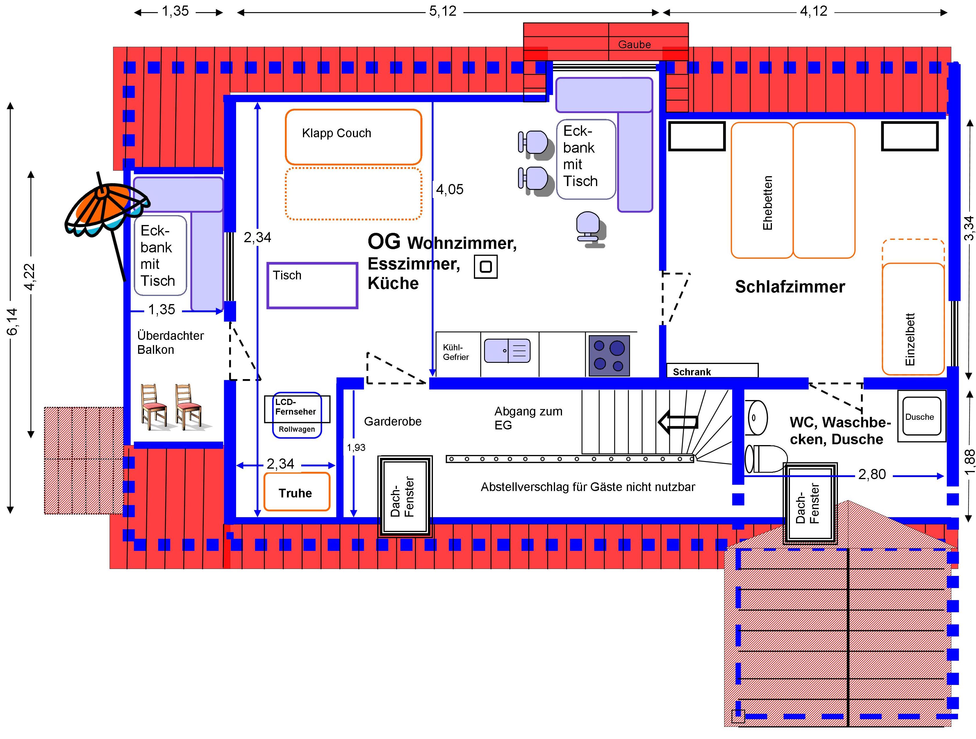 | Die Wohnung hat eine Küchenzeile mit Kühlschrank und kleinem Gefrierfach, Backofen und ist ausgestattet mit Kaffeemaschine, Wasserkocher, Toaster und ausreichendem Geschirr.